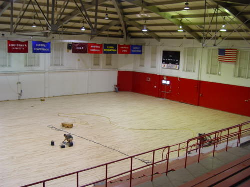 The maple floor is installed, the sanding has begun.