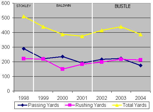 1998 1999 2000 2001 2002 2003 2004 Passing Yards 289 220 236 191 216 223 174 Rushing Yards 221 219 151 183 199 216 213 Total Yards 510 439 387 374 415 439 388