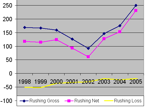 YEAR 1998 1999 2000 2001 2002 2003 2004 2005 Rushing Gross 169 166 160 127 92 146 176 250 Rushing Net 118 114 124 93 61 127 153 231 Rushing Loss -51 -52 -36 -33 -31 -19 -23 -19